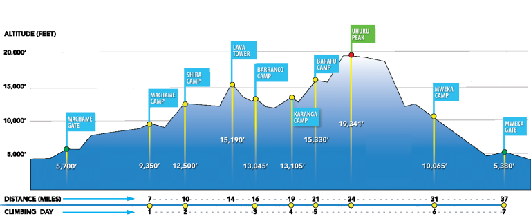 Embrace the adventure with the Machame Route for an unforgettable Kilimanjaro experience. Starting at Machame Gate (1,800 meters), offers a captivating journey to the Roof of Africa. Begin your adventure through a majestic rainforest, ascending to Shira Camp where it meets the Lemosho Route. Traverse Kilimanjaro’s southern side via Lava Tower to Barranco, then conquer the Great Barranco Wall on your way to Barafu Camp. Summit success leads to a descent via the scenic Mweka Trail.